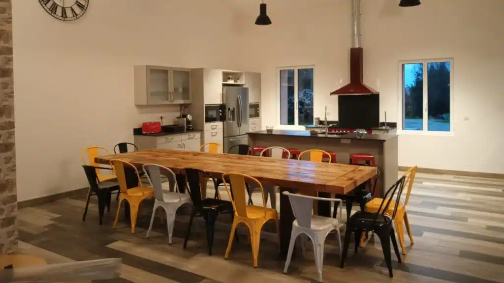 Découvrez tous les équipements de notre gîte, conçus pour enrichir votre séjour et vous fournir le maximum de confort et de divertissement. Avec le Wifi disponible sur tout le site, vous resterez connecté en toute facilité. Profitez d’une expérience cinématographique avec notre télé et vidéoprojecteur, idéal pour les soirées films. Nos installations de loisirs comprennent un boulodrome, un terrain de basket, et un trampoline pour des heures d’amusement. Le salon extérieur est équipé d’une cuisine avec BBQ et plancha, parfait pour des repas conviviaux en plein air. La cuisine américaine moderne dispose d’un îlot central, complétée par des divertissements tels que baby-foot, fléchettes, et un bar professionnel près de la piscine. De plus, notre machine à café, machine à bière, et fontaine à eau réfrigérée garantissent des rafraîchissements à tout moment.